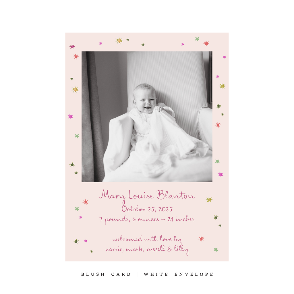 The Angela Birth Announcement from the Lauren Q Collection features playful colors and original artwork, designed to celebrate your little one with a vibrant, modern touch. Measuring 5x7", this card is made for a 4x4" photo—perfect for sharing your baby’s first big moment.
