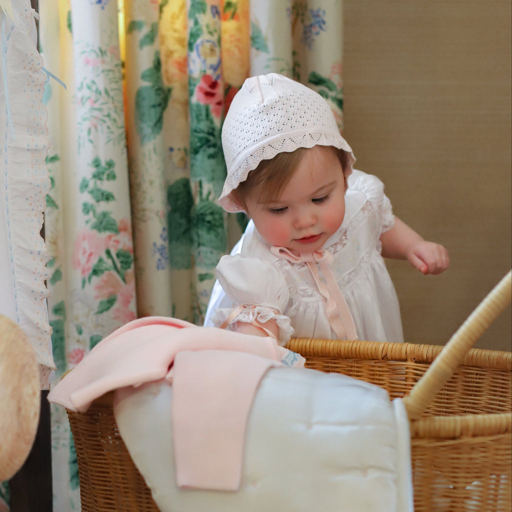 This set features a two-button cardigan with ribbed knitting on the yoke and a sweet pointelle bonnet. Perfect for those nippy weather days of autumn and spring - baby will be kept warm while looking as classy as ever!