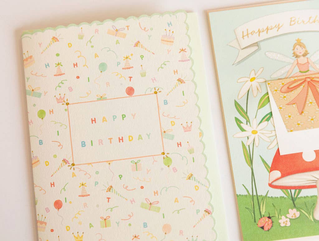 Our Birthday Wishes greeting card is printed and foiled in Memphis, TN. Full color ink printed on natural white paper, letterpress printed in gold foil, and paired with a pale green envelope. Book folded card, blank on the inside.