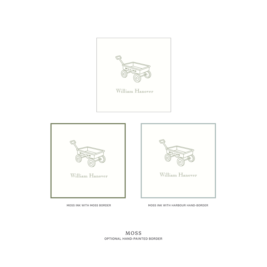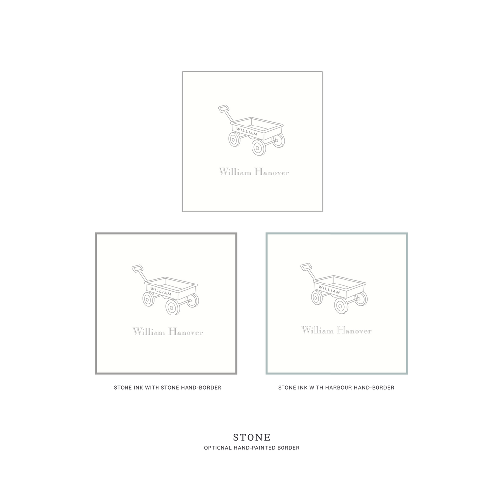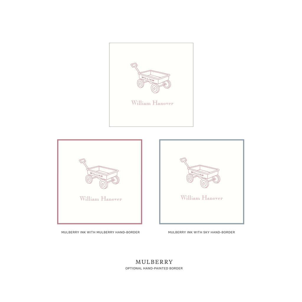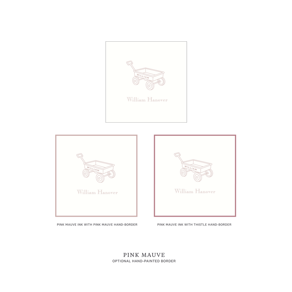 Traditionally chosen for boys, this sweet design is just as charming for a girl when paired with softer ink colors. The wagon illustration adds a touch of vintage childhood without feeling overly playful — refined, timeless, and thoughtful.