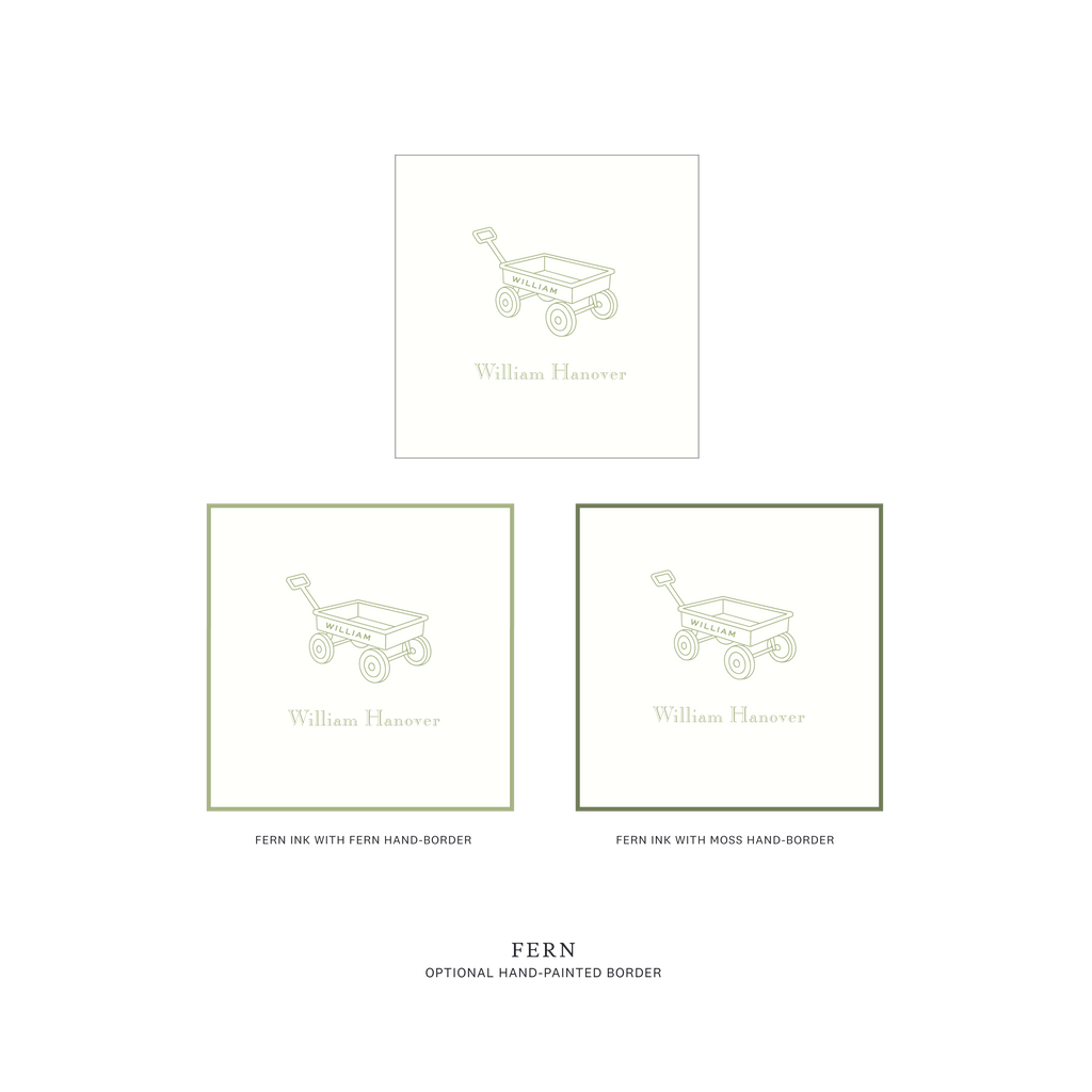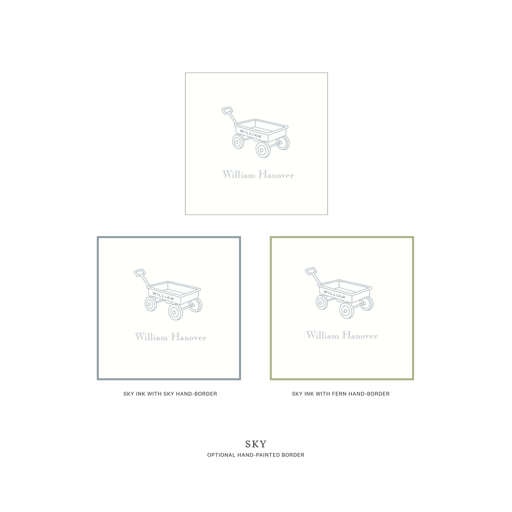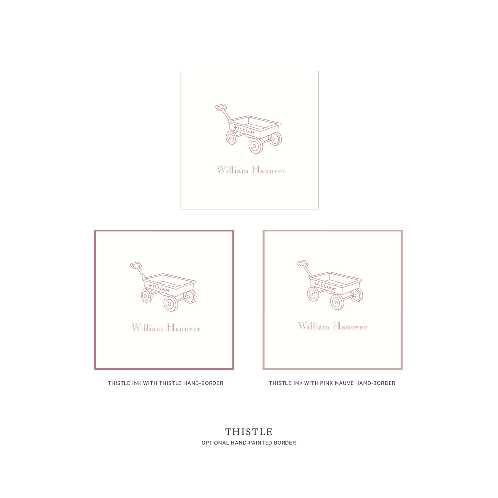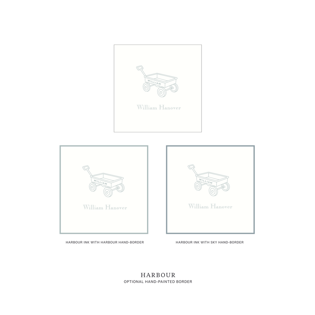 Traditionally chosen for boys, this sweet design is just as charming for a girl when paired with softer ink colors. The wagon illustration adds a touch of vintage childhood without feeling overly playful — refined, timeless, and thoughtful.