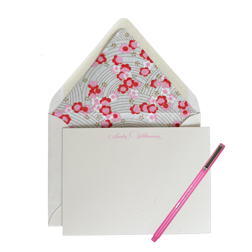 A classic, personalized stationery set—ready to gift or use right away. Each set is custom printed with your name in your choice of font style, making it perfect for thank you notes, thoughtful gifts, or everyday correspondence.