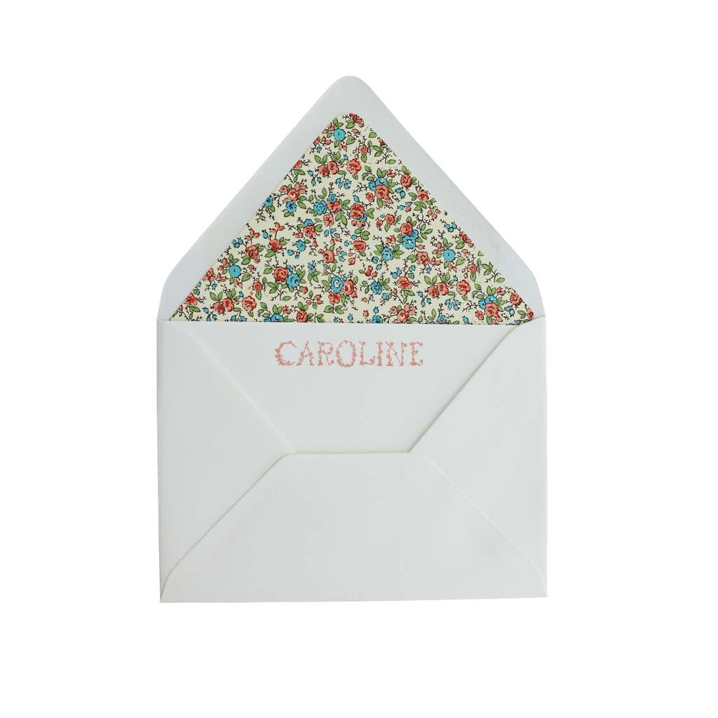 Add a touch of vibrant beauty to your correspondence with our Damask Rose Stationery Set featuring paper sourced by Jody during her travels to London. The liner features petite flowers in coral and melon with green leaves.