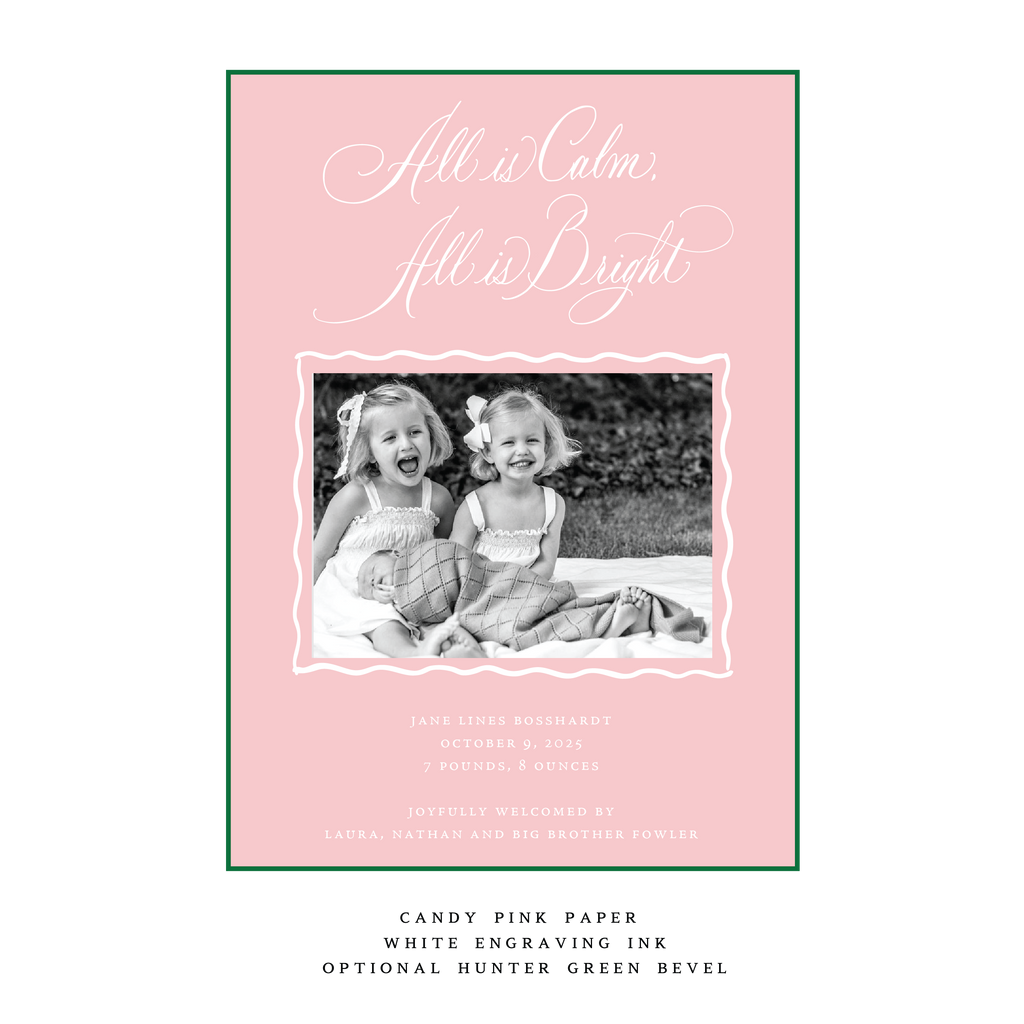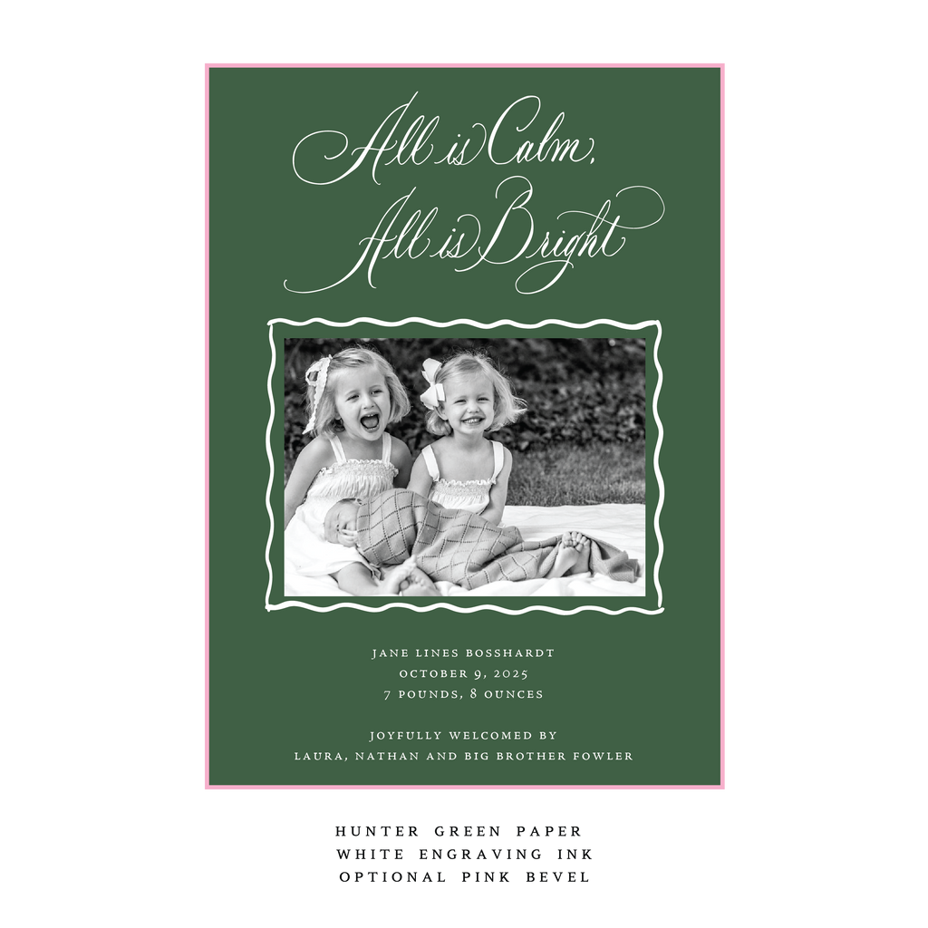 The Jane Card from the Laura Lines x Jody Geary Holiday Collection features artwork by Laura Lines, paired with colorways carefully curated by Jody Geary. Each of the three unique paper colors is engraved with a coordinating ink, creating a vibrant yet timeless design that feels festive and personal. The result is a rich yet delicate design that feels timeless, celebratory, and perfectly suited for welcoming your little one.