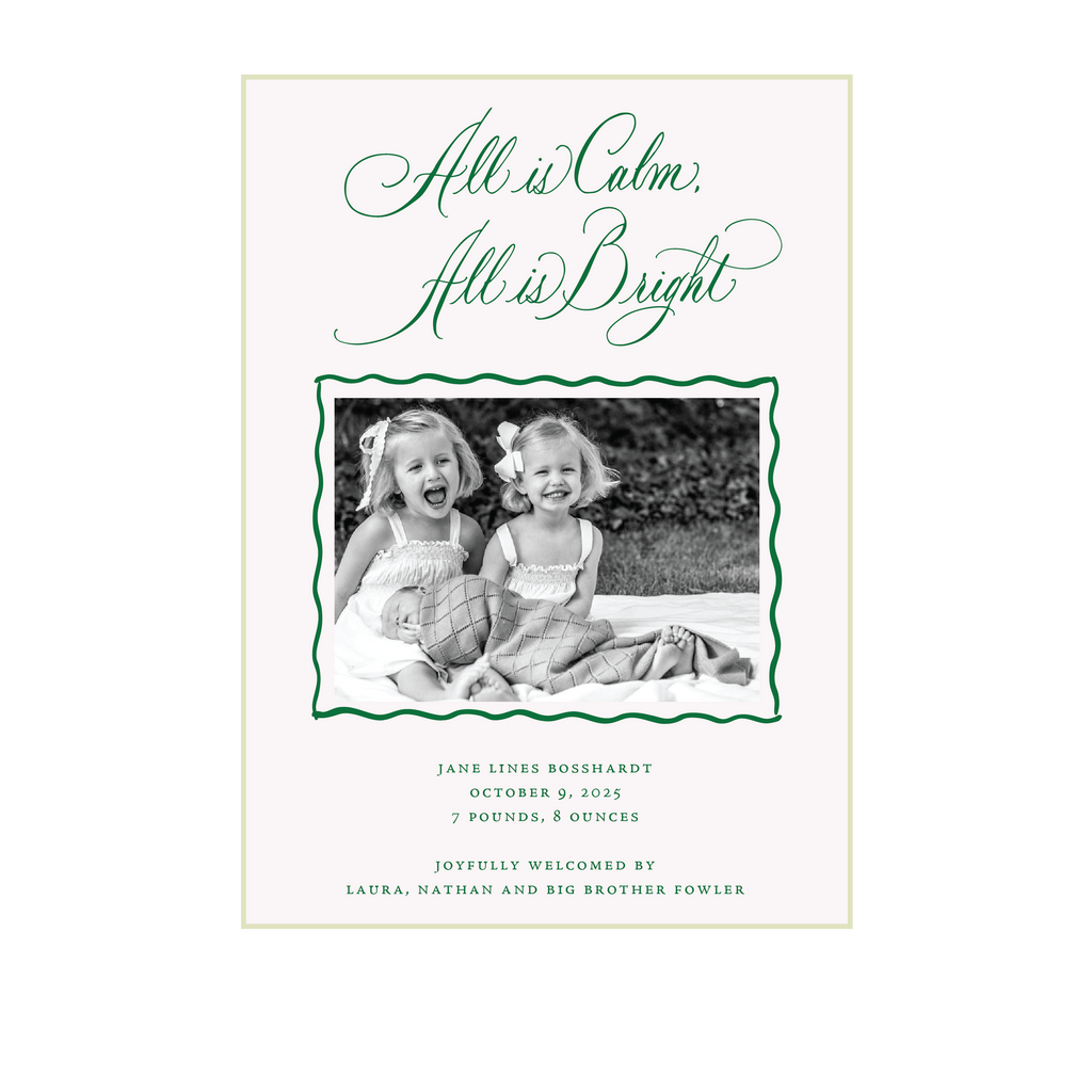 At the top of the card, you may choose from four different calligraphy styles—each one written by Laura Lines herself—allowing you to personalize your design with a hand-crafted touch. Designed for a 3.5x2.5" photo, this card balances space for your family’s picture with Laura’s thoughtful lettering and design.