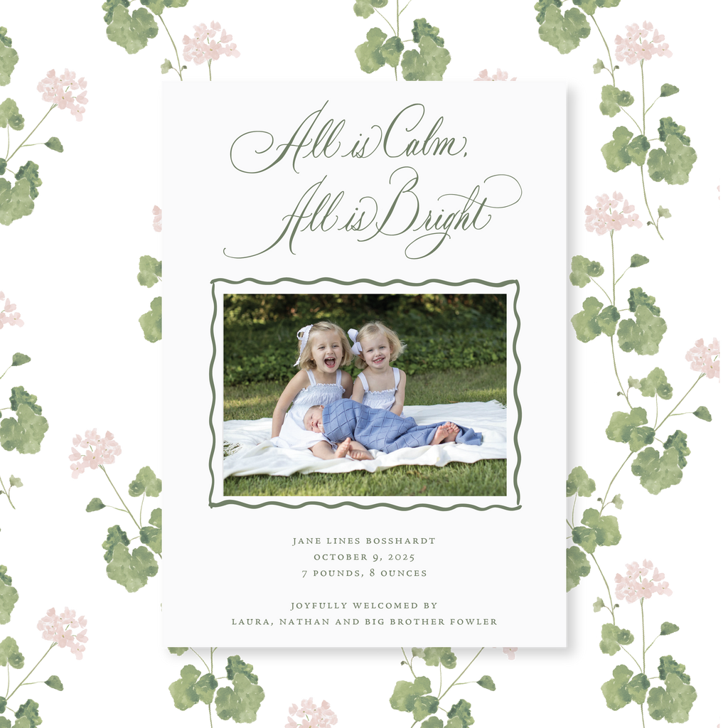 The Jane Card highlights the elegant calligraphy of Laura Lines, now reimagined as a refined birth announcement. Each card is letterpressed on double-thick paper in your choice of soft white or blush, with ink options in sage or berry. The result is a rich yet delicate design that feels timeless, celebratory, and perfectly suited for welcoming your little one.