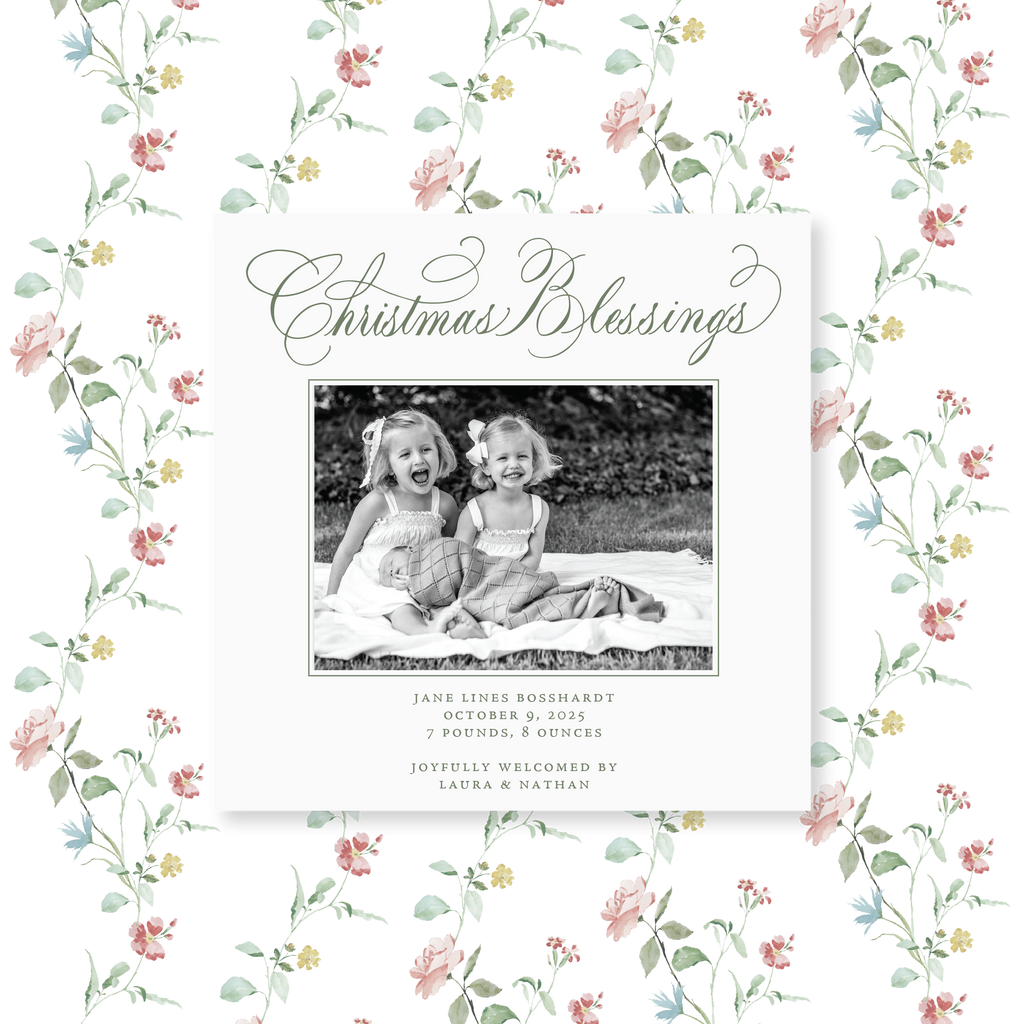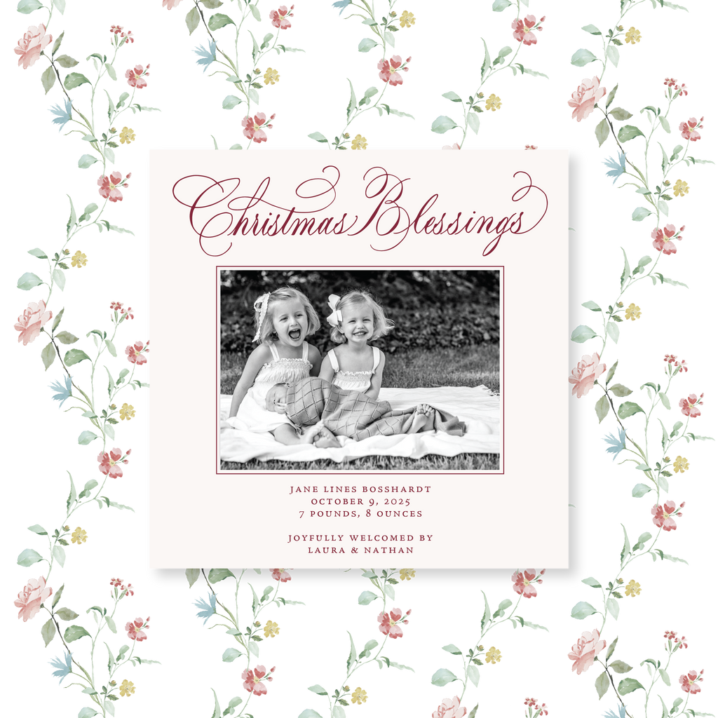The Laura Card highlights the elegant calligraphy of Laura Lines, now reimagined as a refined birth announcement. Each card is letterpressed on double-thick paper in your choice of soft white or blush, with ink options in sage or berry. The result is a rich yet delicate design that feels timeless, celebratory, and perfectly suited for welcoming your little one.