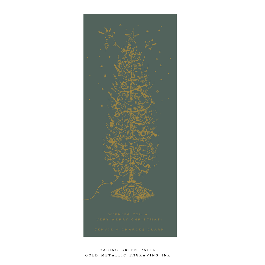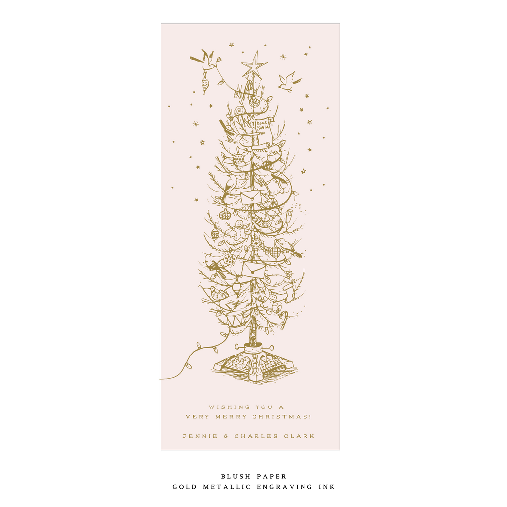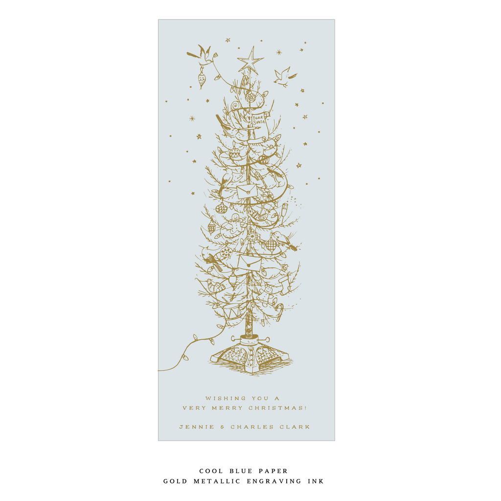 This card is printed on luxurious double thick paper. Each card includes an engraved return address, and the envelope is perfectly matched to the paper color for a seamless finish. This thoughtful pairing of paper, ink, and artistry makes the Kirby Card a standout option in our holiday collection.
