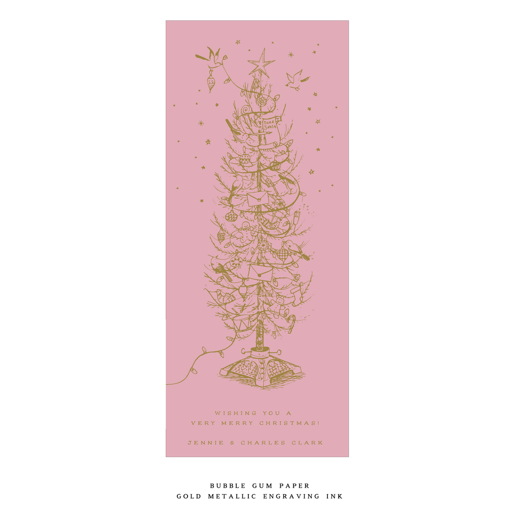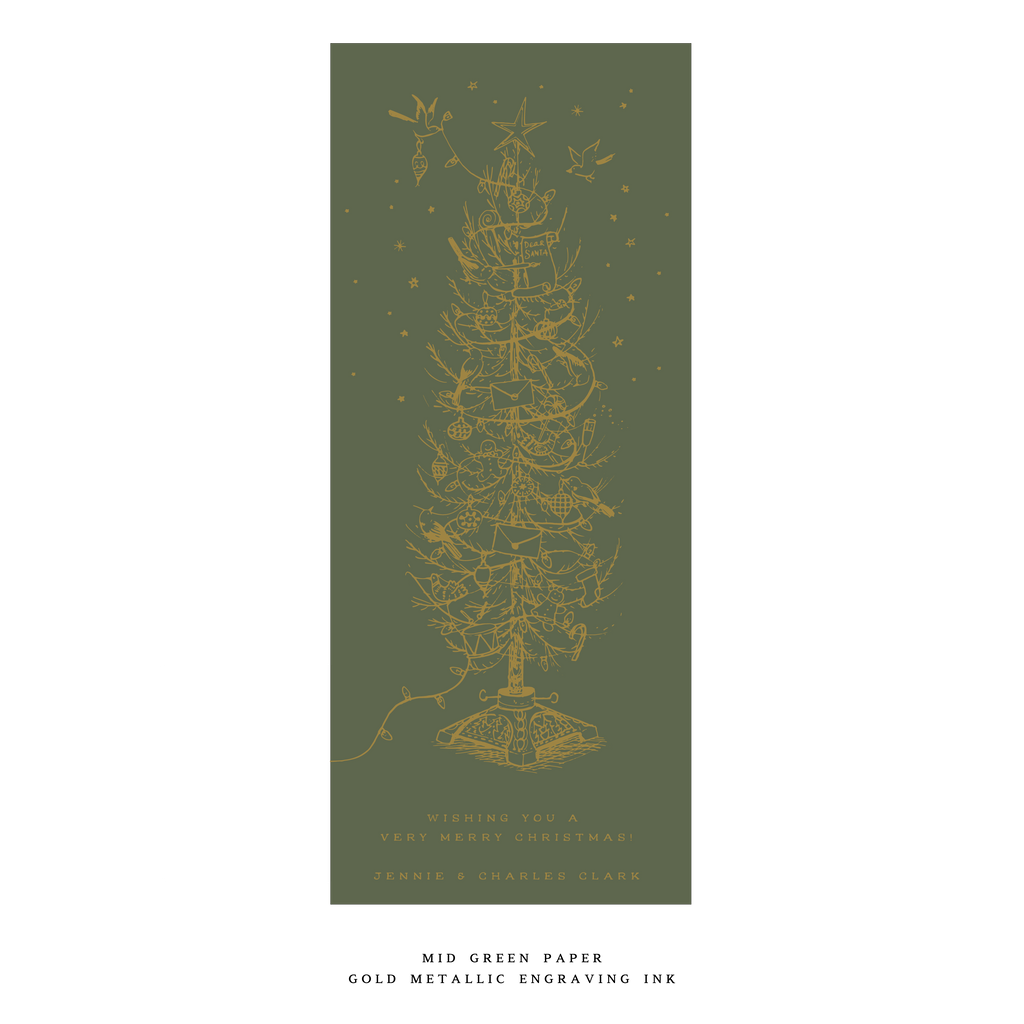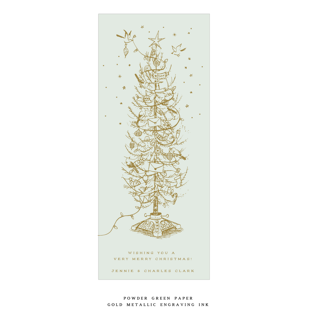 This card is printed on luxurious double thick paper. Each card includes an engraved return address, and the envelope is perfectly matched to the paper color for a seamless finish. This thoughtful pairing of paper, ink, and artistry makes the Kirby Card a standout option in our holiday collection.