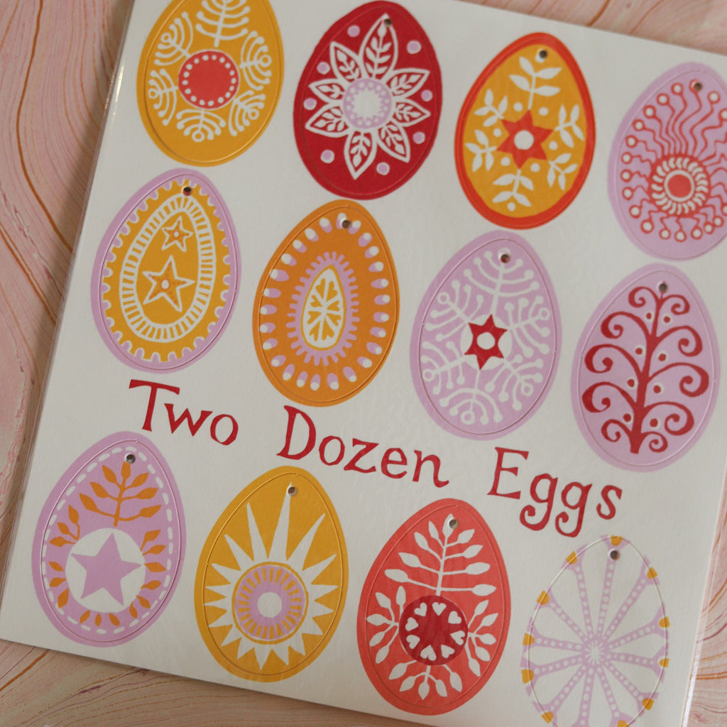 Set of 24 assorted patterned egg decorations crafted from premium 600gsm ivory card, printed on both sides in hand-mixed colours. Pre-cut and ready to display—hang individually or string together as a festive garland using ribbon, thread, or yarn of your choice. Perfect for Easter displays and spring décor. Designed and printed in England on sustainable card with eco-friendly ink.