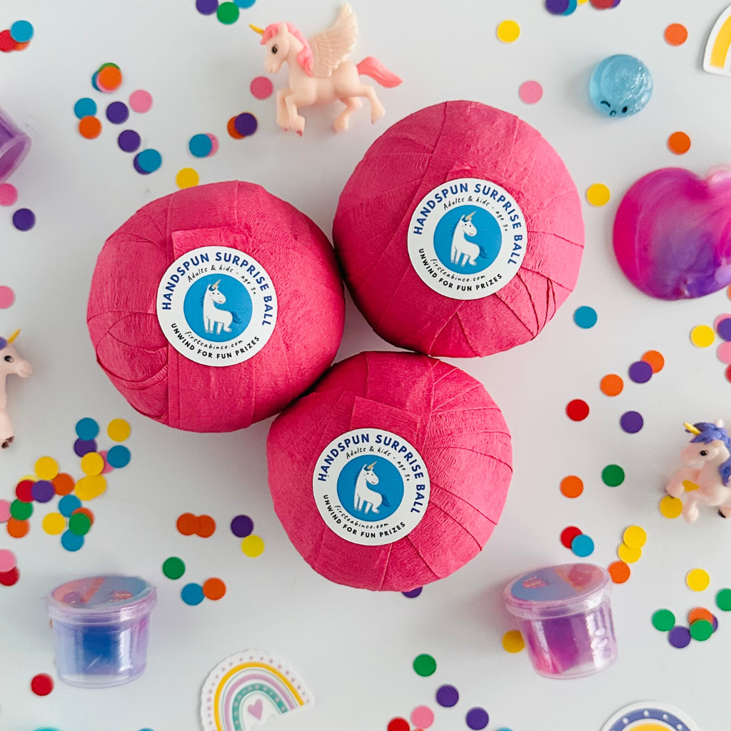 A surprise ball is a tightly wound ball of crepe paper ribbons that, when unraveled, reveals tiny gifts, toys, and keepsakes. It is a fun gift to give or receive. This particular ball was curated with the unicorn lover in mind. It contains a flying unicorn figurine, unicorn slime, a unicorn bracelet, and a rainbow vinyl sticker. Surprise balls are wrapped in pink crepe paper; the innermost layer is tissue paper. The colors and designs of the surprises inside vary (the surprise is part of what makes it so fun). Surprise balls are handmade. Contains small parts. Adult supervision is required for children under 3