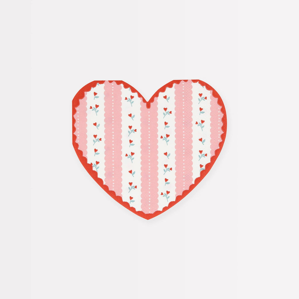 Vintage-inspired heart napkins featuring romantic red rose motifs with heart-shaped buds, delicate pink and red tones, and a playful ricrac border—perfect for setting the scene for a Valentine’s celebration.